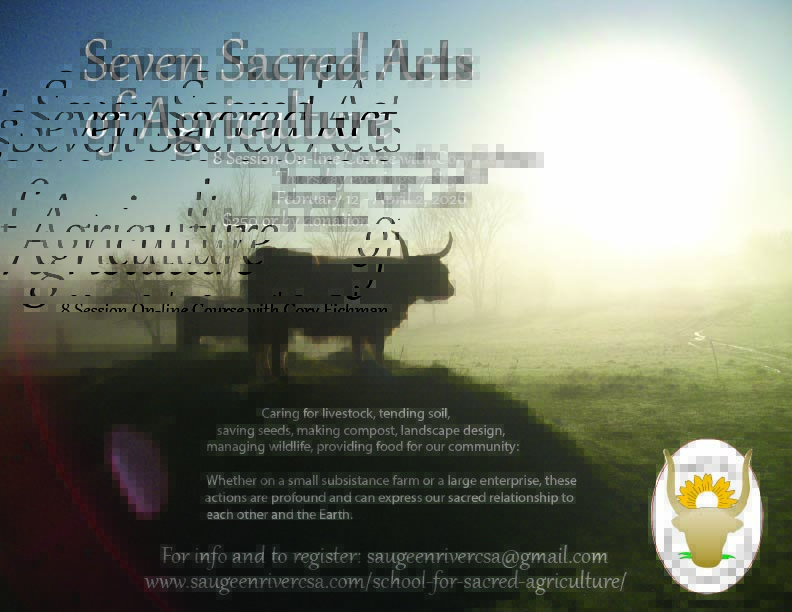 Starting February 12 in the evenings I will host an 8 week on-line course: Seven Sacred Acts of Agriculture. For info and to register email: saugeenrivercsa@gmail.com If you reply to this post, please provide your name and contact info (I can’t tell who replies to posts through the website).