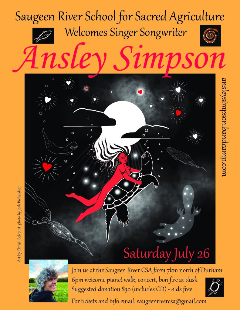 Starting at 6pm we will do a welcoming planet walk. You can walk the paths of the planets (from a Geo-centric perspective) to experience how plants express the connection between the heavens and the Earth. At 7 Ansley Simpson will play songs and tell stories from her album “She Fell From the Sky” exploring the Anishinaabe creation story of Sky Woman. She will also be debuting some new material. You can find her music at: https://ansleysimpson.bandcamp.com/ “Ansley Simpson is an award-winning Anishinaabe singer-songwriter from Toronto, and a member of Alderville FN. A weaver of haunting vocals and poetics, their songs unfold as stories, immersing the listener in vibrant imagery, journeying us through themes of vulnerably, love, and heartbreak.” She’ll be playing from our back porch with seating around our yard and camp fire. We’ll have marshmallows for roasting, cold herbal teas and Georgia will be selling her cookies. We are limiting the numbers because of parking and the space in our backyard, so please let me know if you want to come by emailing saugeenrivercsa@gmail.com Suggested donation of $30 for the concert also gets you a copy of Ansley’s CD. Bring your own chair or blanket.