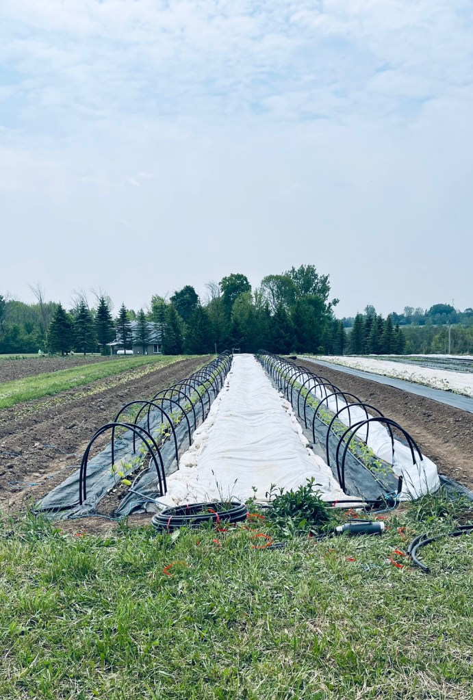 A few people were asking, and it’s a stormy afternoon, so I thought I’d share how the capital contributions are working this year. A capital expense is something (usually over $500) that provides a new direction (even in a small way) for how the farm operates. A couple of years ago this was the building of our movable chicken wagon that allows the chickens to move through the garden’s rest areas during the growing season. This year the capital contributions are going towards mini hoop greenhouses for peppers and eggplant in the garden. I used to grow them as greenhouse crops. But after two years of late blight affecting the outside tomato crops, I realized I needed to grow more of the tomatoes under cover. Since tomatoes need height it made sense to move them all into the existing greenhouse space and put the eggplant and peppers (shorter plants) outside in mini hoops. Below is Simon and I setting them up early June. I don’t have an updated shot, but the plants are liking the extra protection.